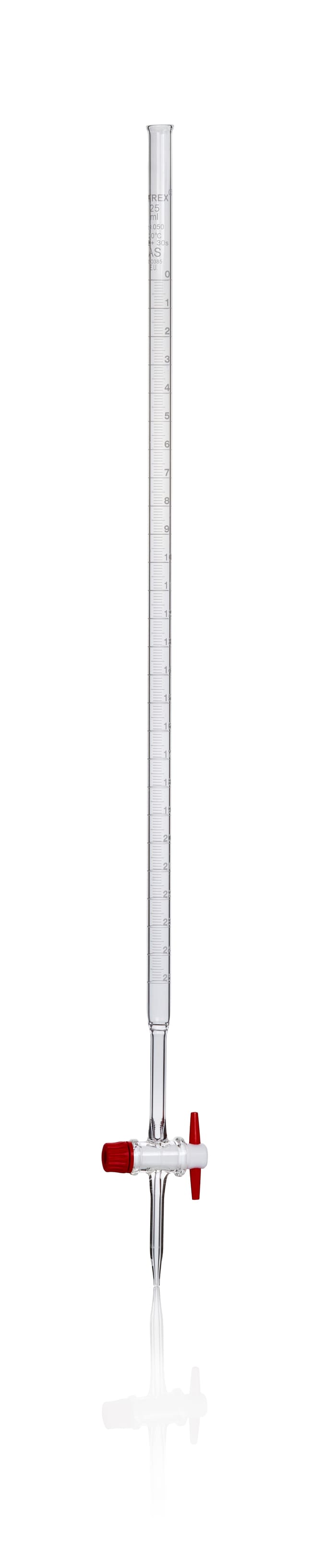 Manufactured from precision-bore tubing (borosilicate glass) for high accuracy and complies with ISO 385 standards. Pyrex™ Labware Class AS Borosilicate Glass Buret includes grease-free interchangeable PTFE key with 1.5mm bore. Graduations in whit